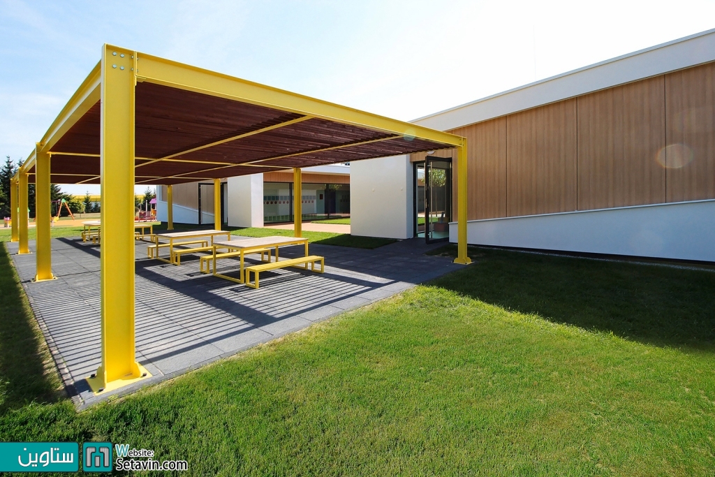 حیاط مرکزی مجموعه، همان طور که در عکس ها ملاحظه می کنید، عملکرد قلب ساختمان را داشته و شامل فضاهای بازی با شن می باشد .نما و جداره های این قسمت از پروژه دارای بازشو های بزرگ بوده که سبب دریافت حداکثر نور طبیعی می گردد . فضای ذخیره سازی و قفسه بندی شده برای کودکان ،به عنوان فیلتری مابین کلاس های درس و حیاط مرکزی عمل می کند و از طرفی سبب ایحاد راه ارتباطی نزدیکتری برای دسترسی کودکان به فضای باز می گردد .