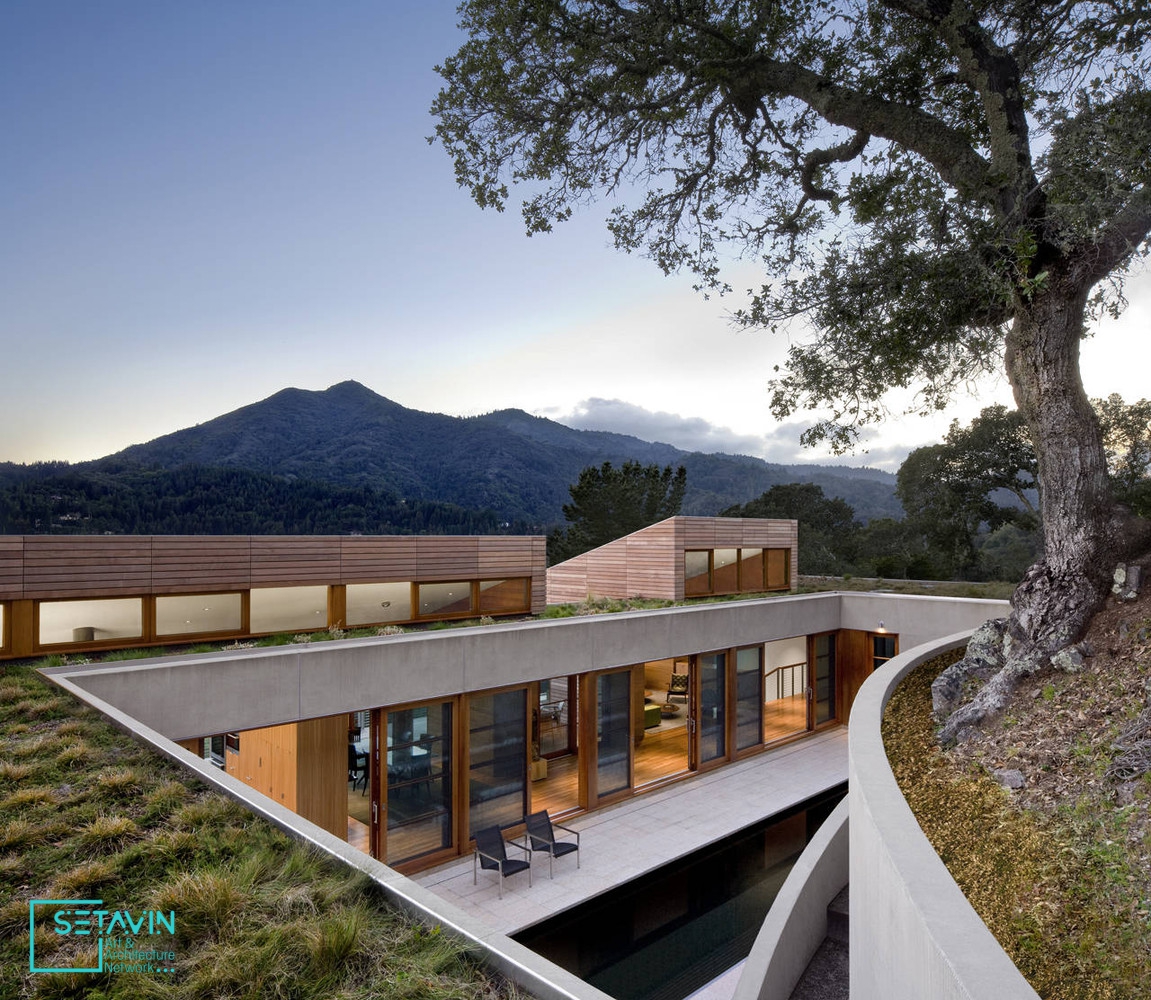در این پست با شبکه هنر و معماری ستاوین همراه باشید تا نگاهی به ویلای مسکونی Kentfield Hillside ، اثر تیم طراحی Turnbull Griffin Haesloop ، در آمریکا , شمال کالیفرنیا داشته باشیم ... طرح بر پایه دید های پانوراما به کوه Tamalpais انجام شده که این دید ،به خوبی منظر خلیج سانفرانسیسکو می باشد . تراز بالایی همچنین با فضای پشتی که شامل تراس و استخرسرپوشیده است، نیزدر ارتباط است که شیب دامنه را قطع کرده و توسط یک جدار حائل محافظت می گردد .
