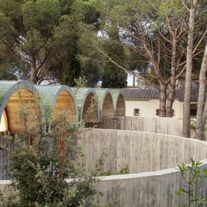 این سازه از دیوارهای بتنی تقویت شده ، ساخته شده است که سقفی را که از طاق های نیم دایره ای که بر روی نمای جنوبی نصب شده اند ، پشتیبانی می کند. سطح بالایی از کاشی های شیشه ای سبز ساخته شده در La Bisbal (Girona) ساخته شده است. قالب دیوارها با تخته های کاج برش خورده مونتاژ شده است که بر خلاف سطح کاشی ها به آنها بافت درشت و مات می بخشد.