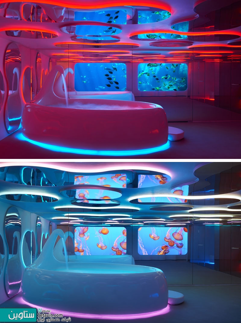 فضای جذاب و ابهام برانگیز اسپا،باعث آرامش و سست شدن بدن و ذهن می شود.نورهای مخفی پشت آینه ها بسته به شرایطی که مورد نیاز است،تغییر رنگ می دهند.