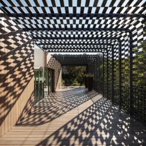 همان طور که در ابتدای پست توضیح داده شد، یکی از اصول مهم در طراحی این بنا ،پاسخ گویی به نیاز ها و عملکرد های پروژه می باشد . از جمله این موارد تداعی موضوع نور و سایه حاصل از درختان می باشد که در این پروژه با شکل گیری صفحات متخلخل ویا به گفته معمار ، دیوار هایی که همچون پرده درجداره ها و سقف ها می باشند، این موضوع به خوبی شکل گرفته است . از طرف دیگر پیش بینی چنین صفحاتی ، دارای همخوانی با پیش فرض اولیه طرح، که همانا ارتباط بصری به محیط پیرامون و حفظ حریم خصوصی از بیرون است، می باشد .