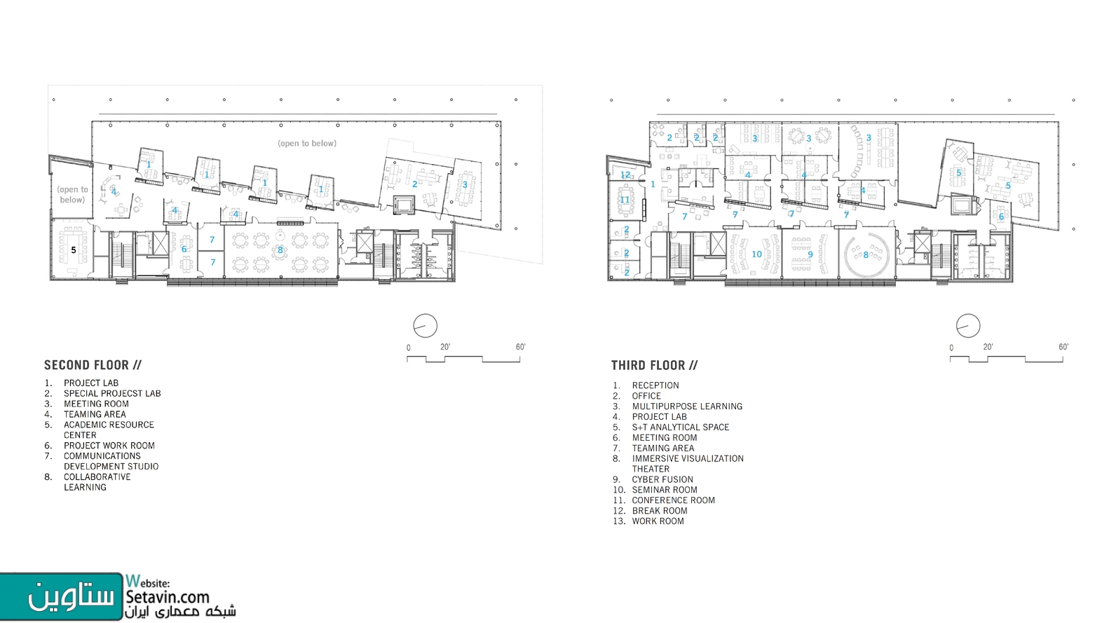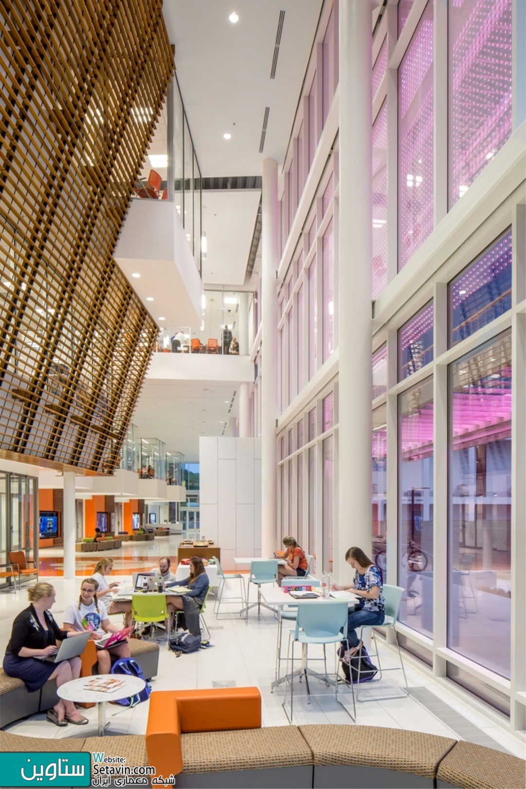 ورودی ساختمان از دو مثلث کوتاه تشکیل شده که از هم فاصله دارند همچنین مسیر عابر پیاده از شمال و جنوب ساختمان دسترسی به فضای گالری را راحت تر کرده است ، تراس هم در طبقه بالا سمت شرقی ساختمان واقع شده است در فضای داخلی نیز نمایشگر رسانه ای مشبک 210 پایی به عنوان نشان ظاهری از نوآوری در داخل ساختمان عمل می کند . با ستاوین همراه باشید .