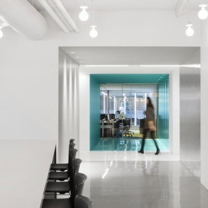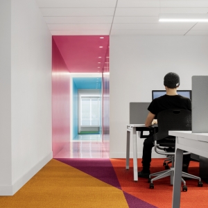 به هر گروه یک رنگ اختصاص یافته و به کارمندان پلیاستر در شرکت حس هویت میبخشد ، فضاهای رنگی در نقاط مختلف پلان فضا توسط یک راهروی تماما سفیدرنگ به سمت مرکز مجموعه به هم مرتبط گشتهاند . این فضا تضادی قوی با سایر بخشها برقرار میکند و نقش محیطی برای استراحت از جنب و جوش جاری در سایر بخشها را دارد , دیوارها، سقف و مبلمان سفید در بخشهایی از فضاهای کاری نیز بکار رفتهاند تا تاثیر قوی رنگهای تند را تعدیل کنند .