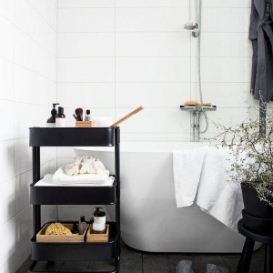 - استفاده از یک طبقه چرخدار از برند IKEA که با لوازم جانبی شیک از قبیل صابون های معطر و مرجان دریایی پر شده، در فضای داخلی حمام بسیار کاربردی و زیبا است.