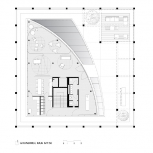 يکي از چالش هاي اصلي طراحي این فضا برآورده کردن الزامات مختلف از جمله راهرو بزرگ ، اتاق هاي ملاقات ، فضاهاي کاري باز ، فضاهاي خلاقانه، فضایی برای ارتباطات اجتماعي براي کارمندان يا سالن های همایش و سخنرانی ، تنها در 2465 متر مکعب و در هفت طبقه می باشد که به بهترین شکل ممکن انجام گرفته است. بنابراين چيدمان فضا در يک شبکه هرمی در اطراف اطاق متصل کننده تمام طبقات به عنوان يک واسط ارتباطي عمودي بهينه سازي شده است.