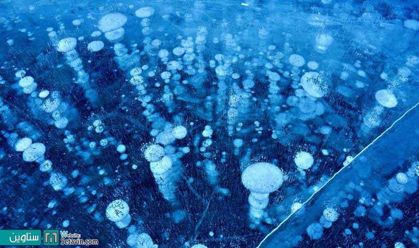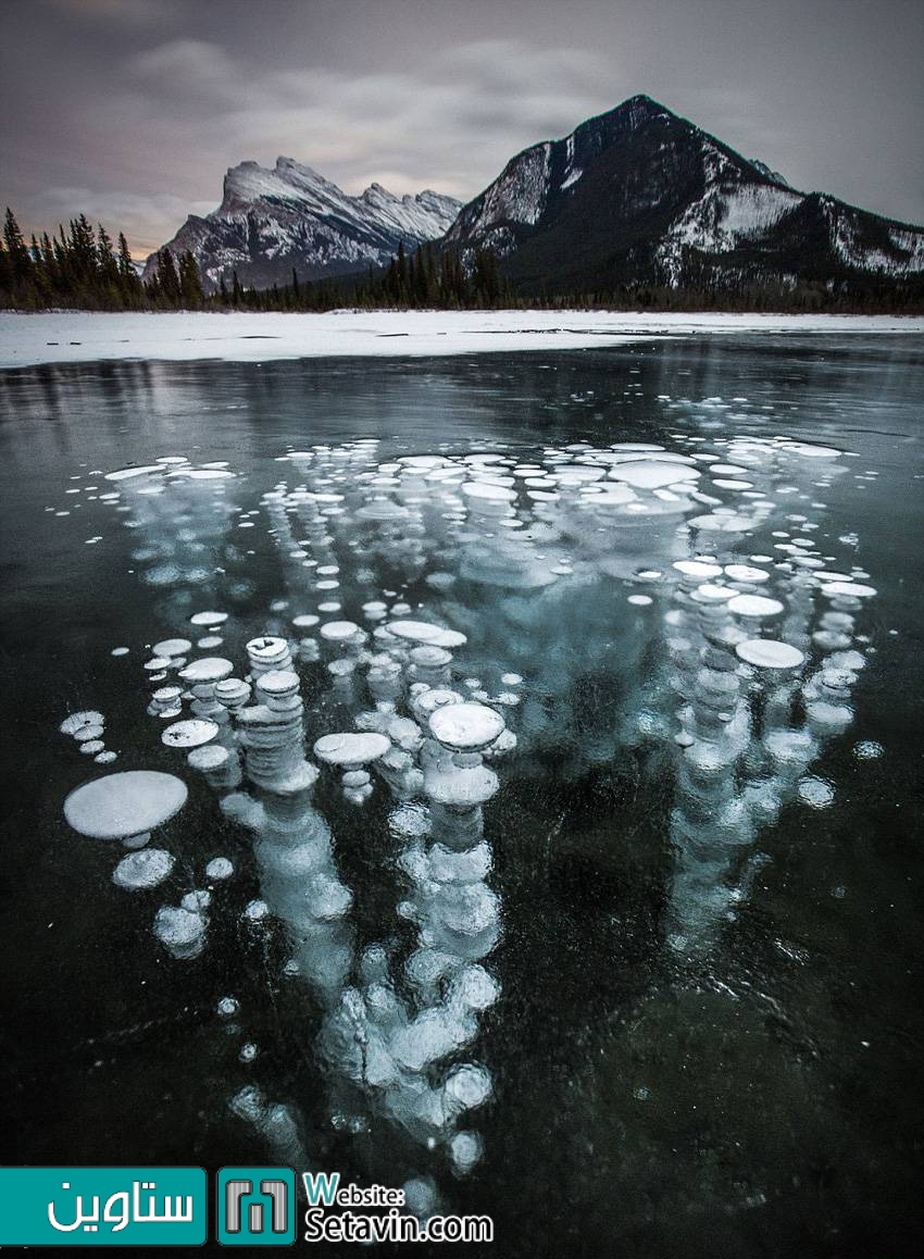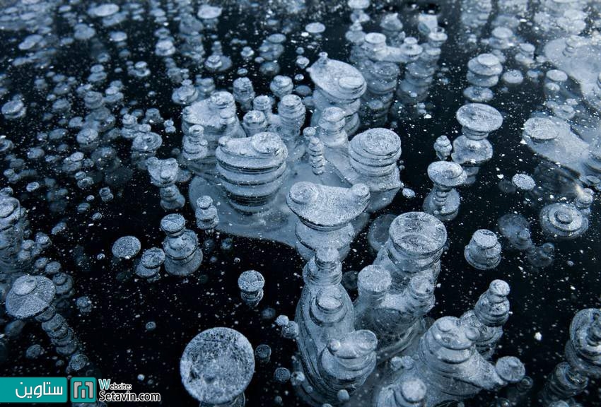این تصاویر، که درپارک ملی بانف درآلبرتای کانادا ،گرفته شده،حباب های یخی زیبای حاوی گاز قابل اشتعال متان رادرمیان یک دریاچه یخ زده به تصویر کشیده است.این گازتوسط باکتری های موجوددراین دریاچه تولید می شود.