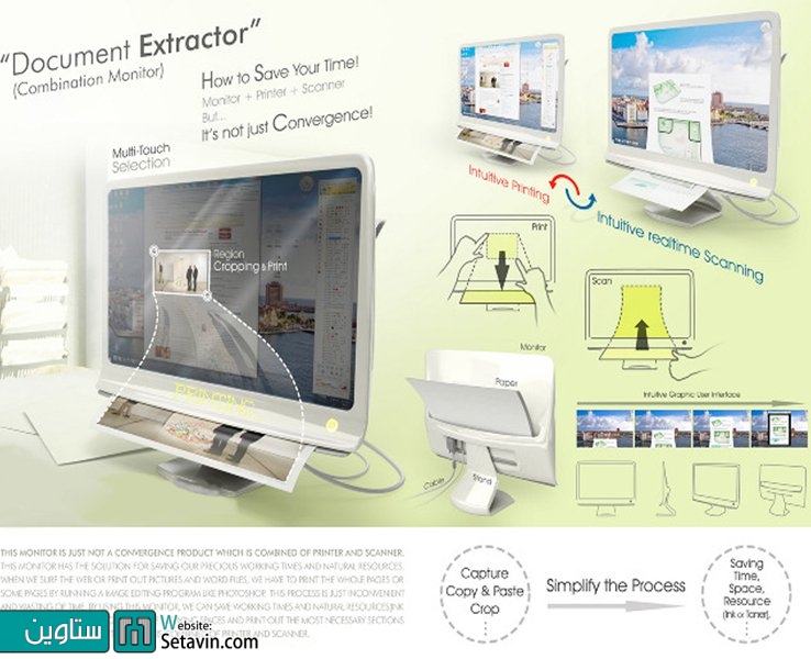 وسیله ای مفید و کاربردی ،اختراعی ازByeong Min Choe ،ترکیبی از مانیتور،پرینتر و اسکنر در یک دستگاه.میزکار شما،با داشتن این وسیله منحصر به فرد، سازمان یافته تر و دارای فضای آزاد بیشتری خواهد بود.مانیتور لمسی به شما اجازه می دهد، تا ابعاد موردنظر خود برای چاپ، را انتخاب و تنظیم نمایید.شما همچنین می توانید یک عکس و یا یک متن را برروی صفحه کاغذ چاپ کنید.کاغذ چاپ شده ازقسمت زیرین مانیتور خارج می شود.