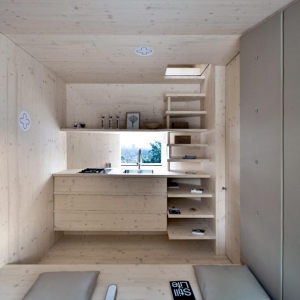 خانه ای , اثر استودیوی اسلوونیایی OFIS Arhitekti با همکاری معماران C + C و C28 ، شرکت مهندسی AKT و پیمانکار Permiz , که اخیرا تبدیل به یک کتابخانه موقت در محوطه قلعه لیوبلیانا شده است ... هر یک از ماژول ها , 2.5 متر عرض ، 4.5 متر طول و 2.7 متر ارتفاع دارد. آنها به گونه ای طراحی شده اند که به عنوان یک سلول واحد کار کنند و فضای کافی برای اتاق ، آشپزخانه و حمام در آن وجود داشته باشد. فضاهای داخلی واحدها نیز قابل انعطاف است. در صورت استفاده از ترکیب می توان آنها را دوباره تنظیم کرد ، بنابراین مناطق خواب از آشپزخانه و سالن جدا می شوند.