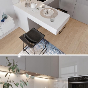 با توجه به مساحت کم آپارتمان،جانمایی آشپزخانه در گوشه نشیمن واقع شده است و برای استفاده حداکثری از فضا،کابینتها در تمامی ارتفاع موجود تا سقف ادامه یافته اند.وجود نرهای مخفی به روشن تر شدن و بزرگتر حس شدن فضا کمک کرده است.