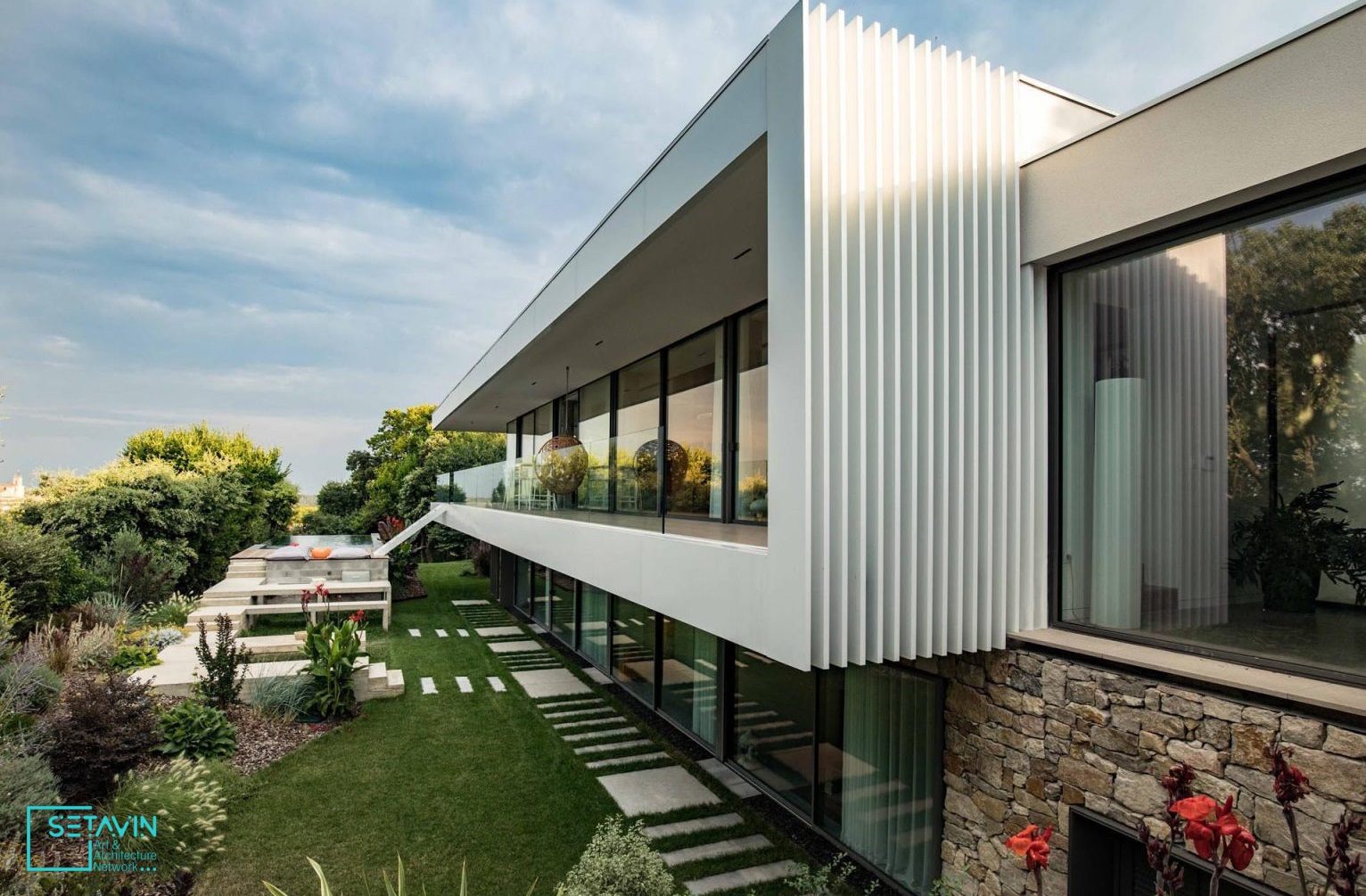 رنگ سفید انتخاب شده به جهت تضاد با زمینه می باشد . عناصر دیگری که به زیبایی این بنا می افزاید ، جداره های شیشه ای و نرده های بالکن می باشد که سبب شکل گیری نمایی پانوراما می گردد. جهت القا گرمی و حس صمیمیت در فضاهای داخل از متریال های چوب و سنگ استفاده شده است . همجنین این بنا دارای یک استخر با منظری زیبا به پیرامون می باشد . با شبکه هنر و معماری ستاوین همراه باشید...