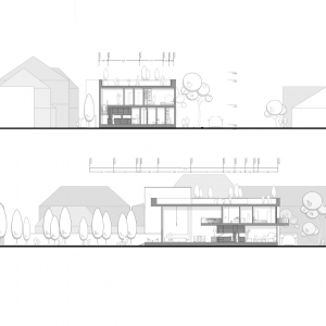 ایجاد تیغه های همراستا با جداره مشترک ساختمان با خیابان شهرک این مرز ایجاد و در نقاط مختلف نقش های گوناگونی اعم از دیواره جدا کننده، آبنما، رواق ورودی، جانپناه و.. پیدا کرد.پروژه علاوه بر جداره های شیشه ای و شفافیت بین فضای بیرون و درون قالب خصوصی خود را هم حفظ کرد. همچون خاصیت معماری برونگرای مسکن در شمال ایران هم ارتباط مناسبی با لند اسکیپ و فضای عمومى شهرک پیدا کرد در صورت صلاحدید ساکنین، و هم میتواند فضای خصوصی خود را به نحو دلخواه داشته باشد. این یعنی ترجمه معماری گذشته این منطقه به زبان امروز و برای کاربر امروزی.