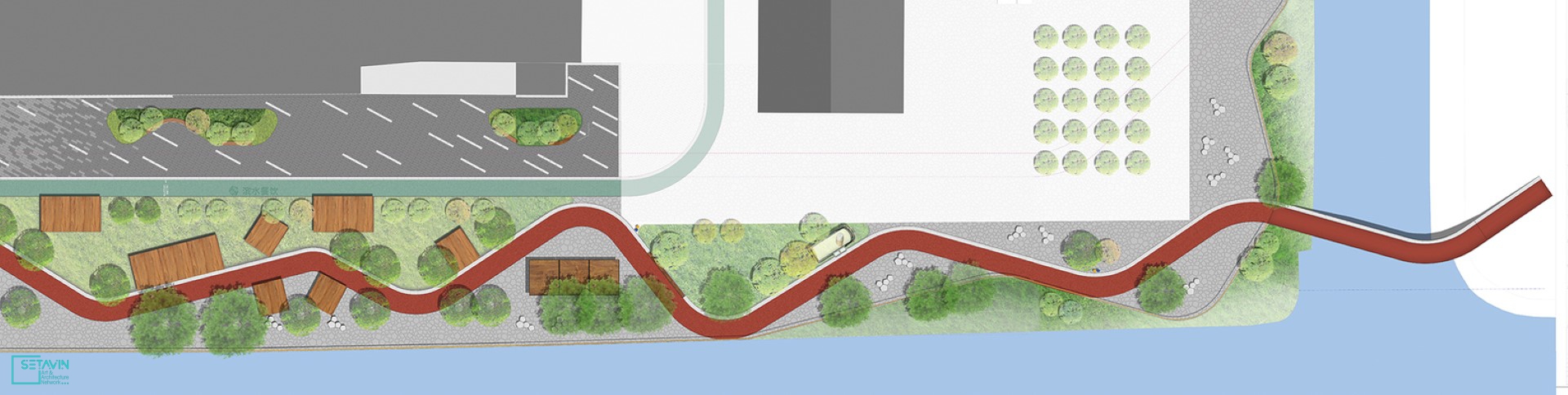طراحی حاشیه رودخانه شامل نوارهای سبز پیوسته مسیرهای پیاده روی، دویدن و دوچرخه سواری و 3 پل عابر پیاده است که کارکرد های مسکونی، آموزشی و تجاری را به هم مرتبط می کند. چشم انداز با لایه بندی چهار منطقه مجزا طراحی شده است که باعث ایجاد نماها و برای اولین بار دسترسی به رودخانه می شود. مناطق خطی شکل ساحلی انتزاعی به خود می گیرند و مجموعه های خلاقانه ای از فعالیت با چمن، کافه، پارک ورزشی و میدان رویداد را در خود جای می دهند.