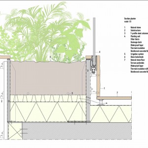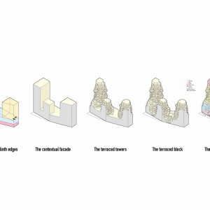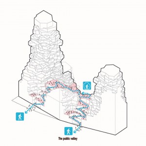منظره‌ای از تراس‌های سنگی ناهموار، پنجره‌های خلیج و بالکن‌های مسکونی که با سنگ طبیعی پوشیده شده‌، دیده می‌شود. همچنین طراحان از آبیاری اتوماتیک در ارتفاع‌های مختلف برای گیاهان در نما استفاده کردند. این فرم مانند یک دره طبیعی به نظر می‌رسد، اما ابزارهای پارامتریک با در نظر گرفتن مقادیر نور و حریم خصوصی مورد نیاز و در عین حال درک محدودیت‌های ساختاری، طرح را بهینه کردند.