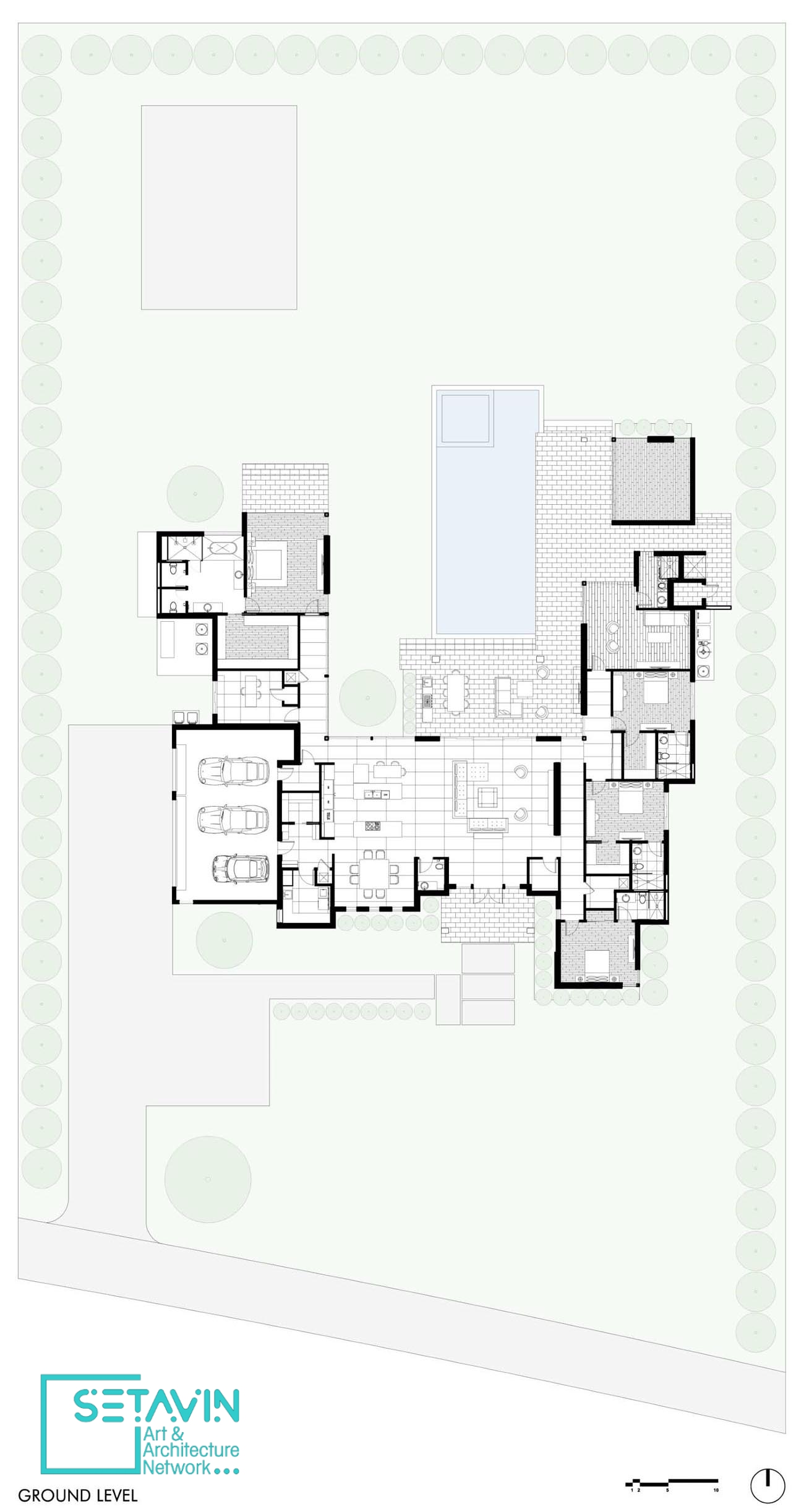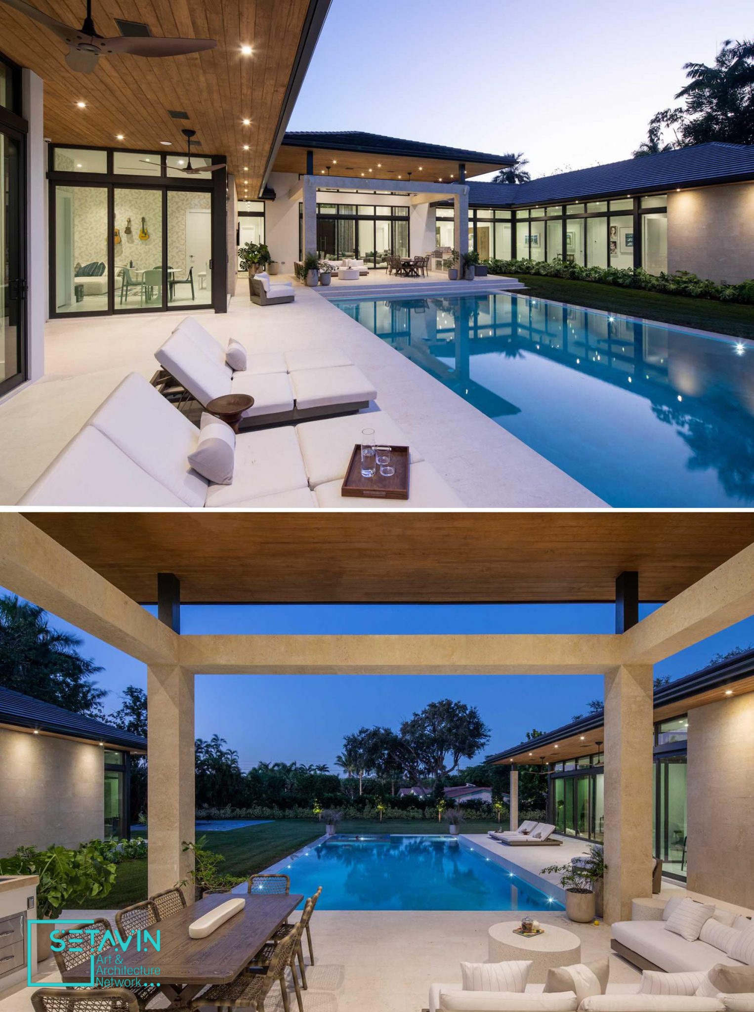 قسمت پشتی خانه طراحی U شکل را نشان میدهد، اتاقخوابها و فضاهای عمومی همگی از طریق پنجرههای کف تا سقف منظرهای به استخر دارند.