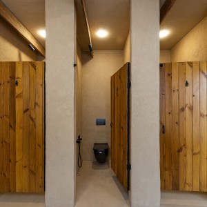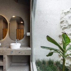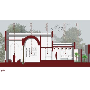 با توجه به وجود بافت ناهمگون و نازیبای سوله های بخش اول با ایجاد دیواری سنگی با دری چوبی کل پروژه از فضای خارج مجزا شد این امر گویای این پیام بود : شما از این در وارد دنیایی دیگر می شوید.