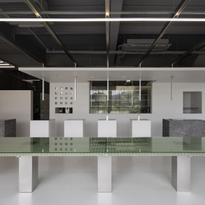 صندلیهایی که به سمت پنجرههای بزرگ قرار گرفتهاند ، مناظری از چشمانداز خارجی را ارائه میدهند . ما مصالح استفاده شده در کف سازی فضای باز را در داخل گسترش دادیم و حس ارتباط با محیط طبیعی را ایجاد کردیم. با بالا رفتن از طبقه دوم، فضایی را می بینید که از طریق آسانسوری که برای بسته بندی محصولات و سالادهای تازه جانمایی شده ، به طبقه اول متصل است. با نشان دادن فرآیند بسته بندی و توزیع به مشتریان ، هدف این فضا القای درک رویه های سیستماتیک و ایمن است . ما همان ساختار سقف را به عنوان طبقه اول حفظ کردیم تا حس تداوم داشته باشیم و مبلمان را طوری چیدیم که امکان غذاخوری را فراهم کند در حالی که مشرف به فضای باز است. علاوه بر این، سیستمی برای تحویل مستقیم محصولات سالم به میزهای ناهارخوری در فضا ادغام شده است و فضاهایی را برای نمایش محصول را تشکیل دهد. این مکان، جایی که می توان محصولات تازه برداشت شده را از مزرعه هوشمند به میز ناهارخوری خود تجربه کرد، آرزو دارد فضایی برای فروش تجربیات تازه و سالم باشد.