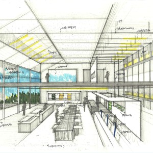 الگوی مربع از سقف شروع می شود، به آب ریز می رسد و در امتداد سطوح دیوار ادامه می یابد و پنجره های کوچک متمرکز بر محصولات را تشکیل می دهد. این الگوها که یادآور ماژول های رشد محصول هستند، در میز مرکزی و جزئیات مبلمان در سرتاسر فضا منعکس می شوند و یک فضای منسجم را ایجاد می کنند. نورپردازی نیز با تمرکز بر عملکرد بیش از تزئینات غیر ضروری طراحی شده است که به شکلی ساده در امتداد ساختار سقف چیده شده است. در مزرعه هوشمند ، جایی که میتوان رشد محصولات را در زمان واقعی مشاهده کرد ، محققان با لباسهای آزمایشگاهی محصولات تازه رشد کرده را مستقیماً به کافه میرسانند. آشپزخانه که به عنوان یک فضای باز طراحی شده است، به مشتریان اجازه می دهد تا فرآیتند شستشو و آماده سازی محصولات را مشاهده کنند.