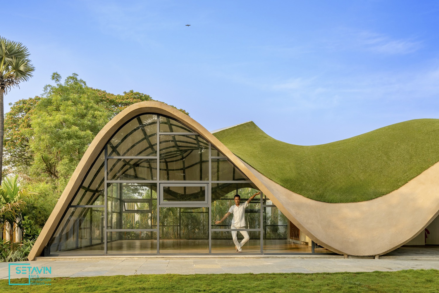 سقف سیال این ساختمان که با چمن پوشیده شده و فاقد هرگونه تکیهگاه داخلی است، با ابزارهای محاسباتی طراحی شده و بهعنوان نمادی از نوآوری در منطقه شناخته میشود. استفاده از مصالح پیشساخته در ساخت این بنا، ضمن بهرهگیری از فناوریهای مدرن و منابع موجود، به بهینهسازی فرایند ساخت و کنترل هزینهها کمک کرده است.