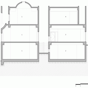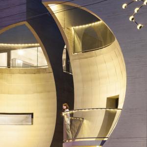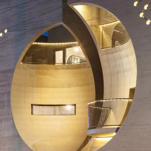 در این پروژه ،دو نکته مهم از اولویت های مورد توجه بوده است: اولین نکته ،بودجه اندک برای ساخت و دومین مساله، ایده بر گرفته از فیلم برخورد دو ماه می باشد . این ساختمان از دوقسمت تشکیل شده است ، هر یک دارای سه طبقه ارتفاع و دسترسی اختصاصی می باشند،البته هیچ راه پله ای در داخل ساختمان وجود ندارد،بلکه پلکان در فاصله میان دو ساختمان وقع شده است.ساختمانها از یکدیگر 2 متر فاصله دارند.در طبقه همکف یکی از ساختمانها،گالری واقع شده است وکافی شاپ،در طبقه وسط ساختمان دیگر قرار دارد.سایر فضاها در هر دو ساختمان،قابل دسترس برای اجاره دادن می باشند و می توانند به عنوان فضای اداری و یا محل برگزاری رویدادی خاص مورد استفاده قرار گیرند.درطبقه آخر هر دو ساختمان،نیز بام سبز محصوری طراحی شده است.موتیفهای دایره ای پنجره های نما ،در داخل ساختمان نیزتکرار شده اند.وید مدور بزرگ داخلی ،امکان نفوذ بیشتر نور را فراهم کرده است.